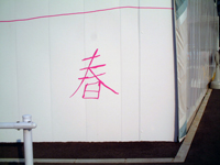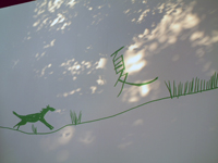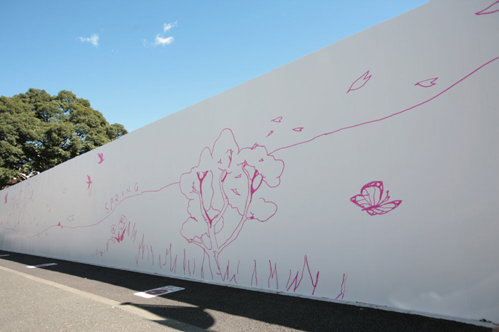 街中にとつぜん現われた、長い長い真っ白な壁のつらなり。春、夏、秋、冬の文字の移りかわりを追っていくと、鳥が、子馬が、シカが、大きな木が、草が、巨大なトンボが、背の高いウサギが、シロクマが次々にあらわれる。セーラー服に赤いリボンの近く小学生が、先生の引率で通りがかり、絵に線を描くように壁画に手をかざしていったりもする。