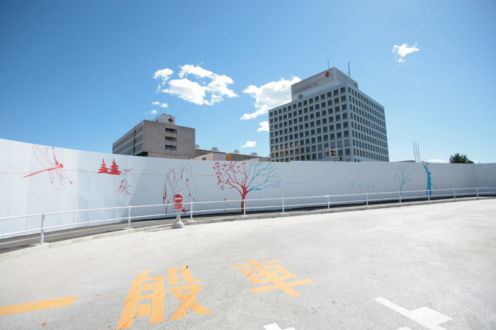 日比谷線広尾駅を降りて、広尾ガーデンヒルズ方向に並木道を歩いていくと、日本赤十字社の医療センターがあり、そのあたりから仮囲いの壁画は始まっている。角を曲がると、小さな郵便局があり、そこを越えたあたりからロータリーを囲む長いカーブを含めた、壁面全体がよく見渡せるエリアに入っていく。