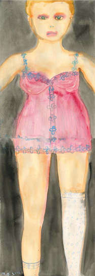 She is a little girl in her father's room, and puts a poppy seed in her mouth.