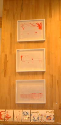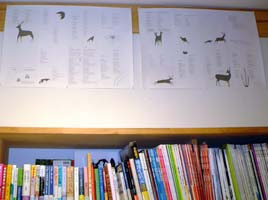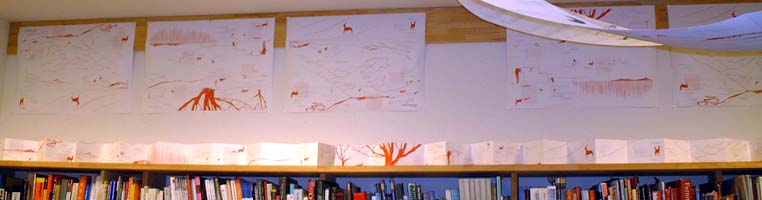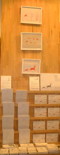 店内の壁面、柱などをつかって、「シカ星」の刷りだしや折る前の絵巻状の本、原画などを展示しました。